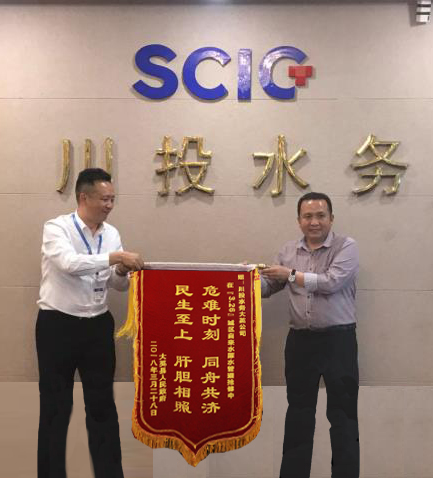 3月28日下午,為鼓勵和感謝川投水務大英公司在“3.26”城區(qū)自來水原水管道搶修中,晝夜不休,堅決保障城區(qū)群眾在最短時間內用上自來水,將飲用水斷供的影響降到最低所做出的突出貢獻,大英縣人民政府黨組成員、工業(yè)集中發(fā)展區(qū)管委會主任何濤,帶領大英縣維穩(wěn)辦主任廖衡一行專程到公司贈送“危難時刻同舟共濟,民生至上肝膽相照”錦旗一面。