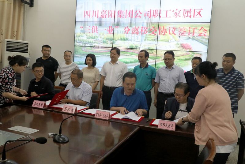 6月3日,嘉陽集團(tuán)“三供一業(yè)”分離移交儀式在犍為縣政府辦公樓105會議室舉行,嘉陽集團(tuán)與犍為縣國資委、犍為縣海源水務(wù)公司、犍為恒邦天燃?xì)夤竞炗喠朔蛛x移交協(xié)議。