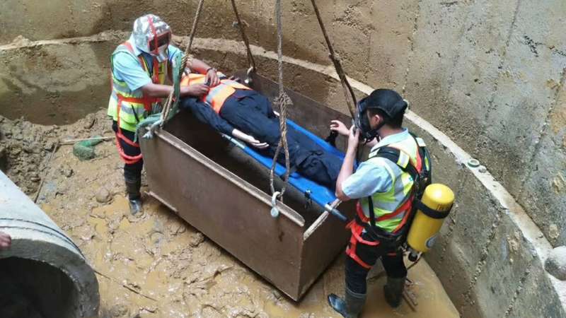 演練活動(dòng)中,現(xiàn)場(chǎng)用假人模擬工作井內(nèi)傷員,然后由安全救援隊(duì)員佩戴有限空間救援裝備,從扶梯下至工作井內(nèi)將傷員固定在擔(dān)架上,并通過(guò)井外吊車(chē)協(xié)助將傷員運(yùn)出工作井。當(dāng)傷員被運(yùn)到地面后,救援隊(duì)員馬上對(duì)傷員進(jìn)行醫(yī)療設(shè)備供氧和心肺復(fù)蘇等救援行動(dòng)。