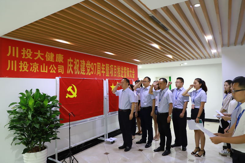 為慶祝中國共產(chǎn)黨成立97周年,深入貫徹習近平總書記四川講話精神,激勵公司全體黨員職工廉潔高效、躬身奮斗,以項目落實落地的成果檢驗學(xué)習成效。6月30日上午,川投大健康與川投涼山公司聯(lián)合舉行了慶祝建黨97周年暨項目推進誓師大會。