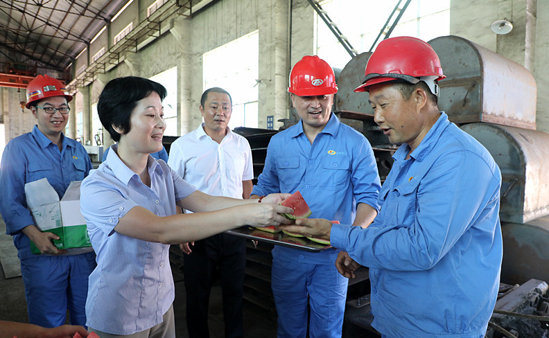 白書(shū)記一行先后來(lái)到川投峨旅石溪小火車(chē)檢修車(chē)間、礦山機(jī)械制造維修分公司進(jìn)行慰問(wèn)。在一臺(tái)正在運(yùn)行的蒸汽機(jī)車(chē)旁,白主席向司機(jī)、司爐師傅遞上西瓜,送上集團(tuán)公司黨政領(lǐng)導(dǎo)的慰問(wèn)與關(guān)懷,她動(dòng)情地對(duì)司爐工說(shuō),“你們持續(xù)在高溫環(huán)境下工作很辛苦,要千萬(wàn)注意自身防暑降溫,注意安全”。車(chē)間里每個(gè)崗位的職工她都一一送上了清涼的西瓜和礦泉水,把組織的關(guān)愛(ài)傳遞到職工身邊。