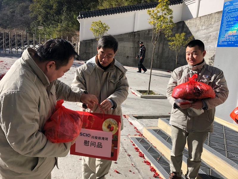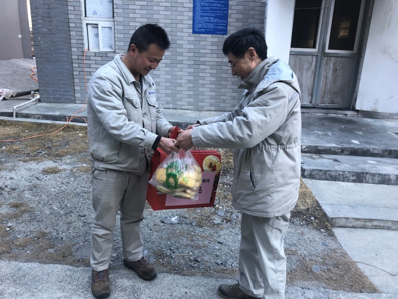 段明一行首先來到了海拔將近三千米的仁宗海水庫大壩,向值守在大壩的員工送來了新春的第一聲問候;此后一路向值守在仁宗海、金窩和大發(fā)廠房的員工送去了公司的問候,以及公司精心為各位值守員工精心準(zhǔn)備的各種食品、飲品。