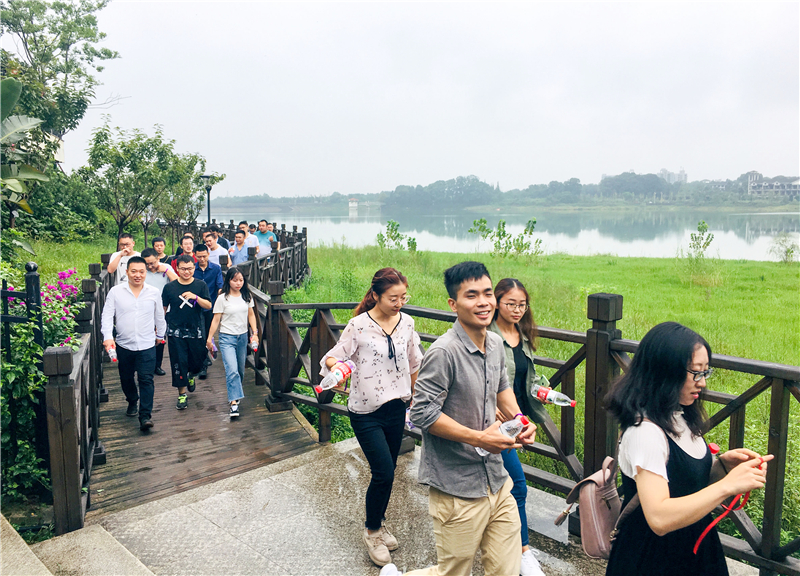 “預(yù)備——出發(fā)”,上午10點(diǎn)40分左右,隨著陳新龍的一聲號(hào)令,由每組8人組成,左臂系著不同顏色的絲帶分別代表粉隊(duì)、紅隊(duì)、紫隊(duì)和藍(lán)隊(duì)的4個(gè)參賽小組隊(duì)員,迅疾啟程踏上環(huán)湖之路競走比賽,峨秀湖環(huán)湖路路程約5公里,此次競賽以環(huán)湖一圈競走,用時(shí)最少回到起點(diǎn)為獲勝隊(duì)。比賽一開始,青年團(tuán)員們就不甘落后,8人一組,富有節(jié)奏地?cái)[動(dòng)雙臂,腳尖有力地輕觸著地面,沿著湖邊蜿蜒小徑浩浩蕩蕩健步前行。沿途中,各參賽小組隊(duì)員或你追我趕,熱情競技,或相伴前行,齊頭并進(jìn),小組隊(duì)員有落后的,大家就互相扶持、鼓勵(lì),不拉下一名隊(duì)員。青年人的朝氣蓬勃為靜謐的峨秀湖增添了一份健康、一份動(dòng)感、一份青春活力。最終,持續(xù)50分鐘的競賽落下帷幕,用時(shí)46分鐘的紫隊(duì)-第3小組以用時(shí)最少的比賽戰(zhàn)績勇奪第一,在歡呼雀躍中結(jié)束了比賽。全體隊(duì)員雖然都已汗流浹背,但深切體驗(yàn)到了團(tuán)隊(duì)的凝聚力、競爭激發(fā)的進(jìn)取心和青春散發(fā)的熱情活力。