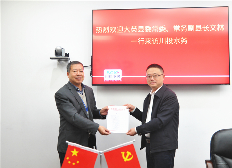 11月19日,大英縣委常委、常務(wù)副縣長(zhǎng)文林來(lái)訪川投水務(wù),并代表大英縣政府向川投集團(tuán)、川投水務(wù)送來(lái)感謝信。川投水務(wù)黨委書記、董事長(zhǎng)梁有國(guó),黨委副書記、總經(jīng)理鄧銳在川投大廈24樓會(huì)議室會(huì)見(jiàn)文副縣長(zhǎng)一行。