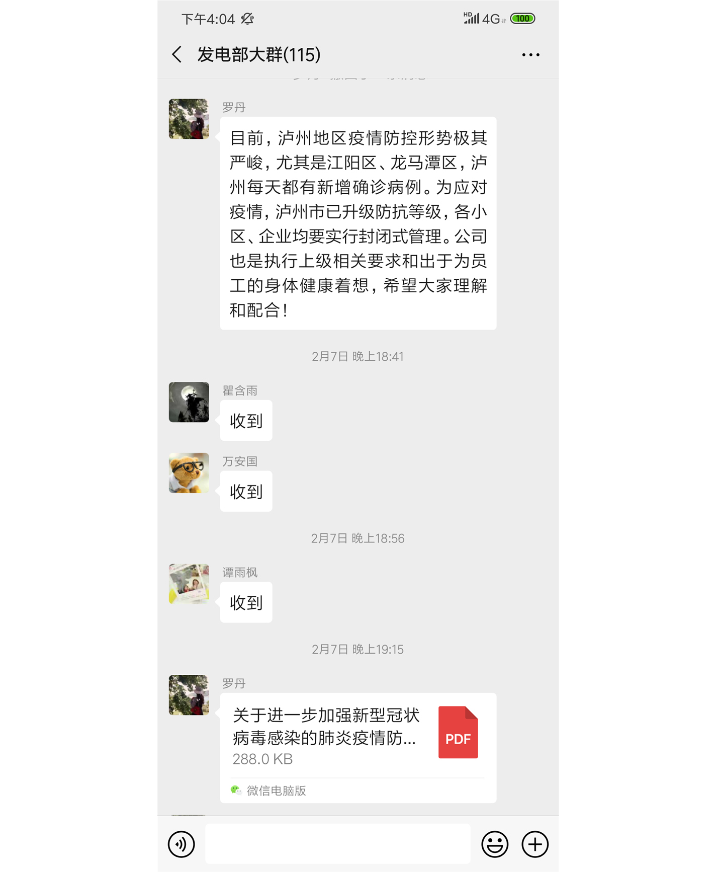 下班后,為讓大家時刻保持對疫情的高度警惕,在工作微信群里,部門管理人員密切關(guān)注班組員工的身體健康動態(tài),同時分享使用酒精和消毒液的方法和小秘訣。在抗擊疫情面前,不能有一絲松懈。