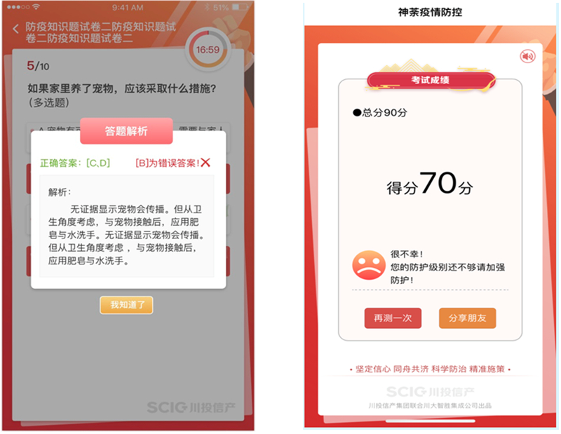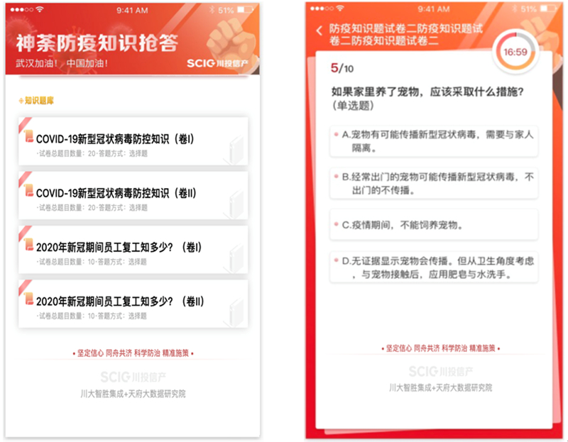 日前,川投信產(chǎn)旗下智勝集成公司、天府大數(shù)據(jù)研究院聯(lián)合推出“神荼防疫知識搶答系統(tǒng)”(“神荼”是中國民間傳說中能制伏惡鬼的神人)。該系統(tǒng)包括COVID-19新型冠狀病毒防控知識(卷I)、COVID-19新型冠狀病毒防控知識(卷II)、2020年新冠期間員工復(fù)工知多少(卷I)、2020年新冠期間員工復(fù)工知多少(卷II)四個題庫,涵蓋了新冠肺炎疫情防控、復(fù)工復(fù)產(chǎn)注意事項等知識,各題庫分為單選、多選、判斷等多題型,可快速生成試卷,靈活配置考題、考題分?jǐn)?shù)和時長,每答完一題,均會彈出正確的答案解析,提升答題者的科學(xué)防疫知識素養(yǎng)。