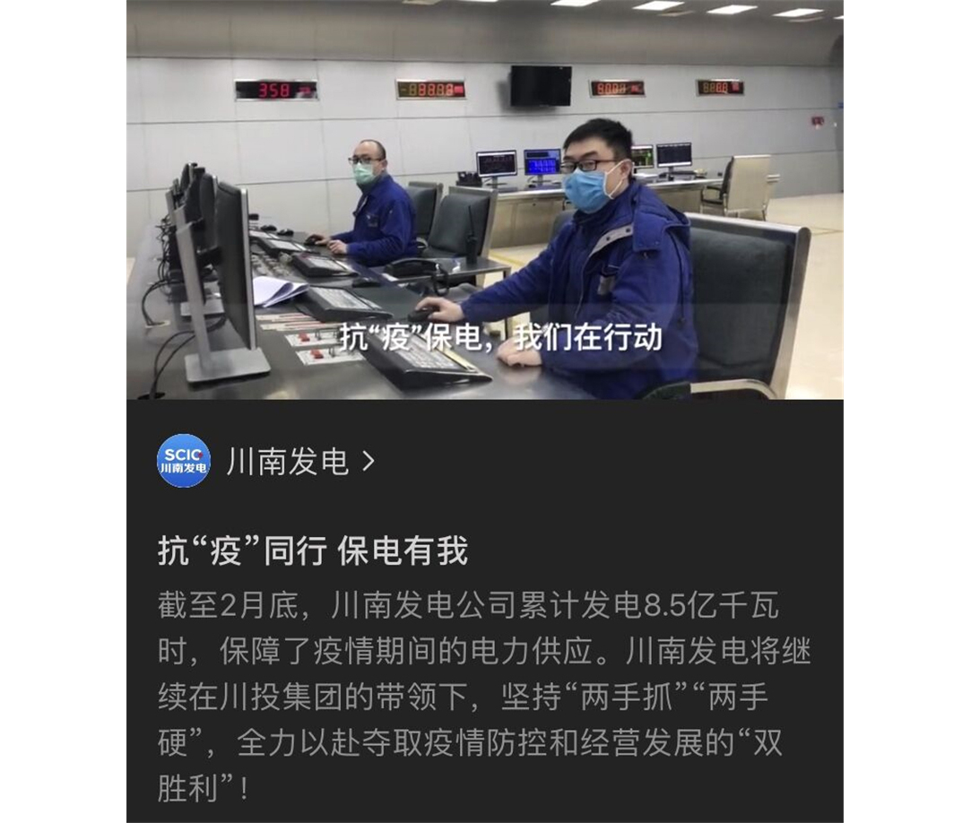 為進(jìn)一步堅(jiān)定公司干部職工誓奪“雙勝利”的信心,提振公司一手抓疫情防控一手抓經(jīng)營發(fā)展的戰(zhàn)斗士氣,3月2日,川南發(fā)電公司拍攝完成了《抗“疫”同行,保電有我》微視頻。該視頻經(jīng)在微信公眾號(hào)上發(fā)布,取得了較好的宣傳效果。