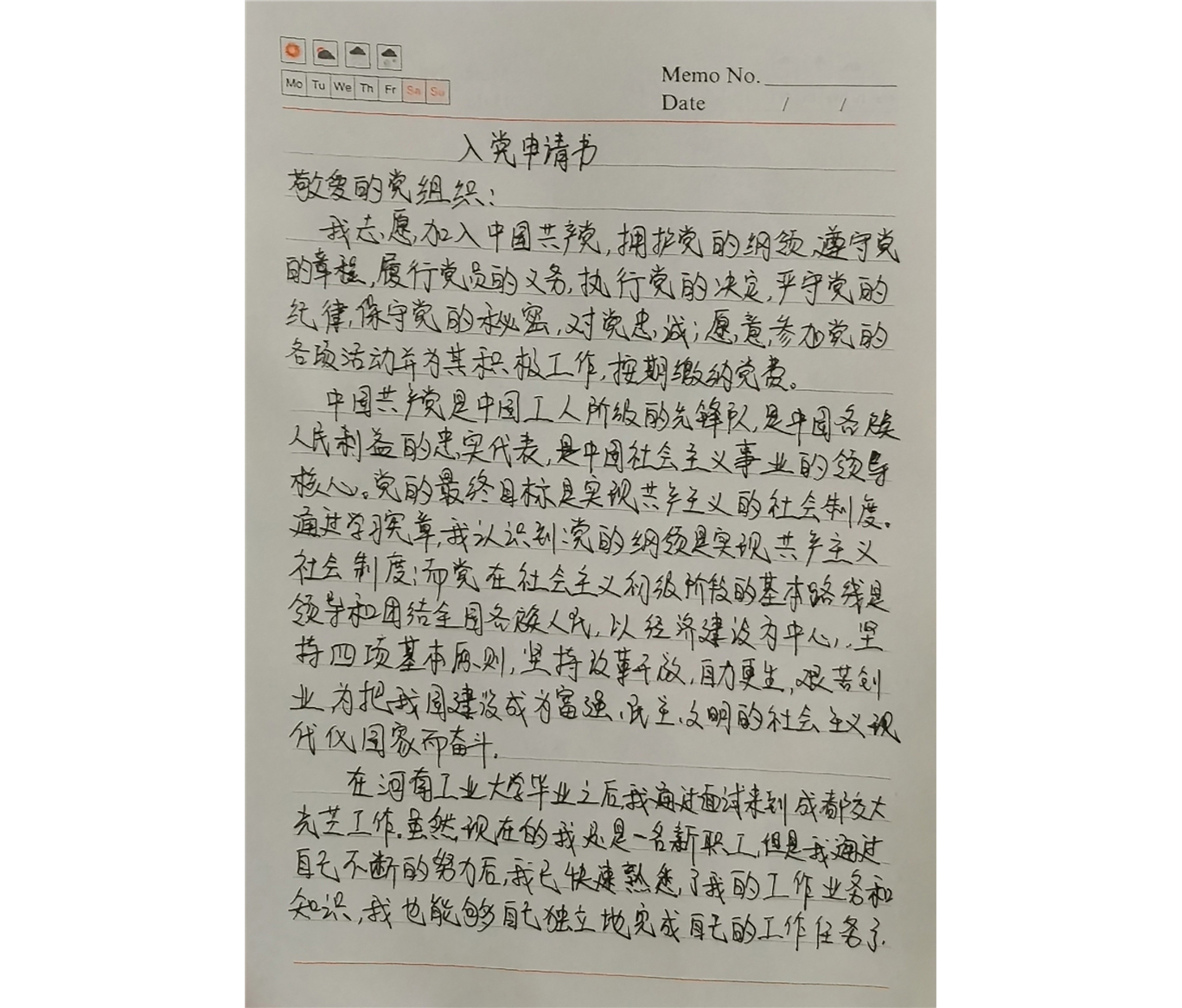 讀大學(xué)時(shí),何啊潭同志就提交了入黨申請(qǐng)書(shū),成為了一名入黨積極分子。在此次防控疫情期間,他又再一次提交了一份“特殊”的入黨申請(qǐng)書(shū)。他在入黨申請(qǐng)書(shū)中寫到“生命重于泰山,恪盡職守是我的使命”,他始終以共產(chǎn)黨員的標(biāo)準(zhǔn)嚴(yán)格要求自己,直到現(xiàn)在,他仍然堅(jiān)守崗位,恪盡職守,始終奮戰(zhàn)在一線工作,用實(shí)際行動(dòng)向黨組織提交了一份“特殊的”入黨申請(qǐng)書(shū)。