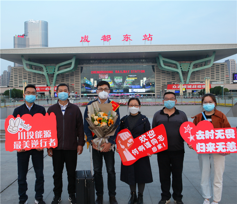 4月25日,川投能源 “最美逆行者”、交大光芒工程突擊隊隊員何啊潭同志圓滿完成在武漢鐵路局的值守任務(wù),帶著勝利和平安凱旋歸來。川投能源黨委副書記、工會主席楊超龍與黨群工作部主任楊鑫以及交大光芒黨總支委員汪志橋一道,手捧鮮花,到成都東站迎接川投能源“最美逆行者”回家。