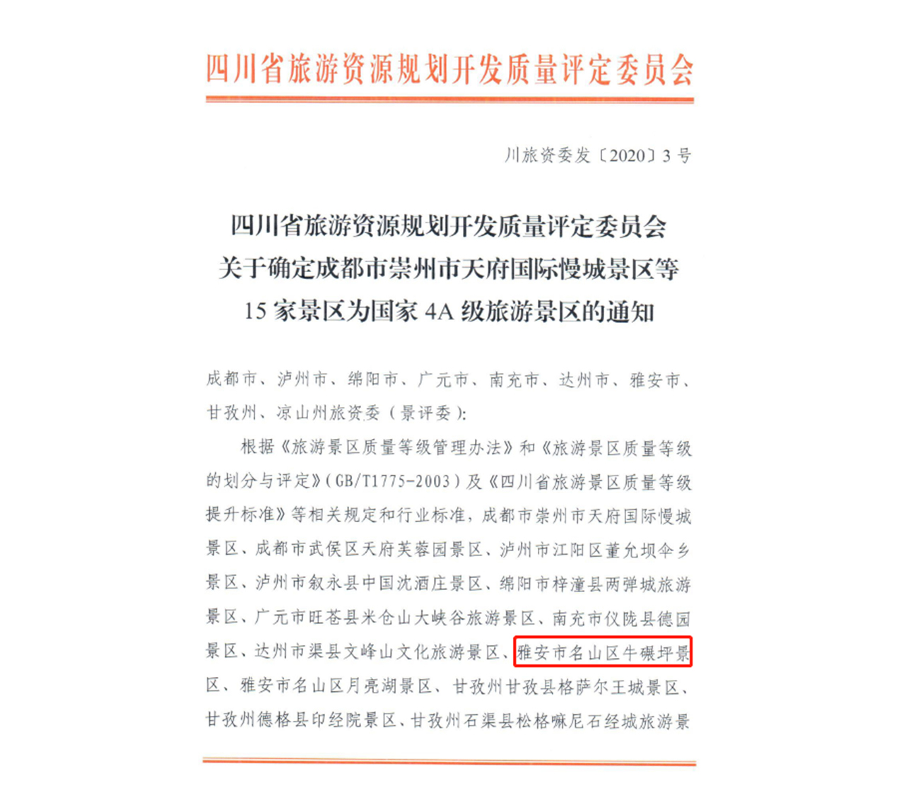 根據(jù)四川省旅游資源規(guī)劃開發(fā)質(zhì)量評定委員會《關(guān)于確定成都市崇州市天府國際慢城景區(qū)等15家景區(qū)為國家4A級旅游景區(qū)的通知》(川旅資委發(fā)〔2020〕3號),四川蒙頂山茶業(yè)有限公司下屬牛碾坪景區(qū)被正式評定為國家4A級旅游景區(qū)。