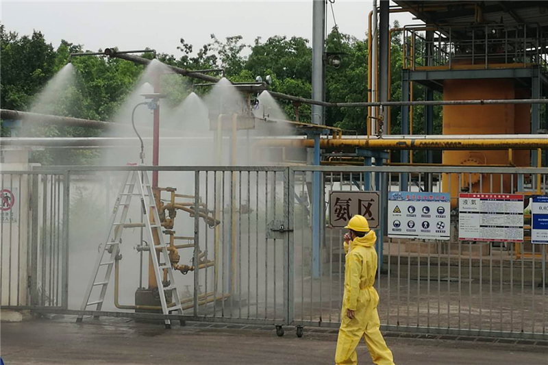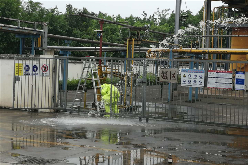 本次演練以氨區(qū)卸氨過程中接卸臂發(fā)生泄漏事故為背景開展。事故發(fā)生后,演練小組立即啟動應(yīng)急預(yù)案。演練過程中各專業(yè)迅速聯(lián)動,密切配合,井然有序地完成了安全警戒與疏散、液氨泄漏消防噴淋稀釋、緊急隔離、液氨泄漏周圍環(huán)境監(jiān)測等4個環(huán)節(jié)的應(yīng)急操作,使應(yīng)急演練取得圓滿成功。