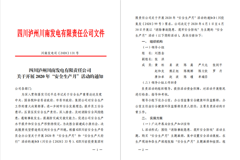 為深入貫徹落實習(xí)近平總書記關(guān)于安全生產(chǎn)重要論述及黨 中央、國務(wù)院和省委省政府、集團公司對安全生產(chǎn)工作的重大決策部署,根據(jù)《四川省安全生產(chǎn)委員會辦公室關(guān)于開展2020年“安全生產(chǎn)月”和“安全生產(chǎn)天府行”活動的通知》《四川省投資集團有限責(zé)任公司關(guān)于開展2020年“安全生產(chǎn)月”活動的通知》要求,近日,川南發(fā)電啟動了以“消除事故隱患、筑牢安全防線”為主題的“安全生產(chǎn)月”活動。