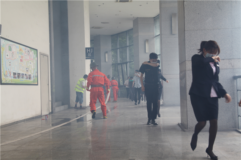 上午10點(diǎn),中心賽場警報聲響起,參演人員用毛巾、衣物等物品自制簡易防護(hù)用具,遮住口鼻,在疏散指揮人員的引導(dǎo)下,從中心賽場二樓看臺快速有序撤離,同時滅火小組進(jìn)入現(xiàn)場對“初期火災(zāi)”進(jìn)行撲救。