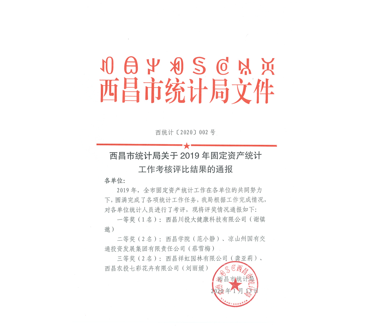 2019年,西昌大健康公司按照西昌市固定資產(chǎn)統(tǒng)計(jì)工作要求,高標(biāo)準(zhǔn)、高要求抓好落實(shí),圓滿完成各項(xiàng)統(tǒng)計(jì)工作任務(wù),公司獲西昌市2019年固定資產(chǎn)統(tǒng)計(jì)工作“一等獎(jiǎng)”。