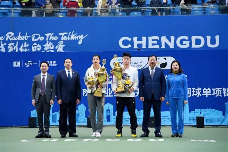 頒獎(jiǎng)儀式上,國(guó)家體育總局網(wǎng)球運(yùn)動(dòng)管理中心主任、黨委書(shū)記、中國(guó)網(wǎng)球協(xié)會(huì)副主席兼秘書(shū)長(zhǎng)劉文斌,四川省成都市人民政府副市長(zhǎng)王平江為男、女單打冠軍吳易昺、劉方舟頒發(fā)冠軍獎(jiǎng)杯。成都文化旅游發(fā)展集團(tuán)有限責(zé)任公司黨委書(shū)記、董事長(zhǎng)張斌,成都銀行行長(zhǎng)王濤為冠軍選手們送上鮮花。