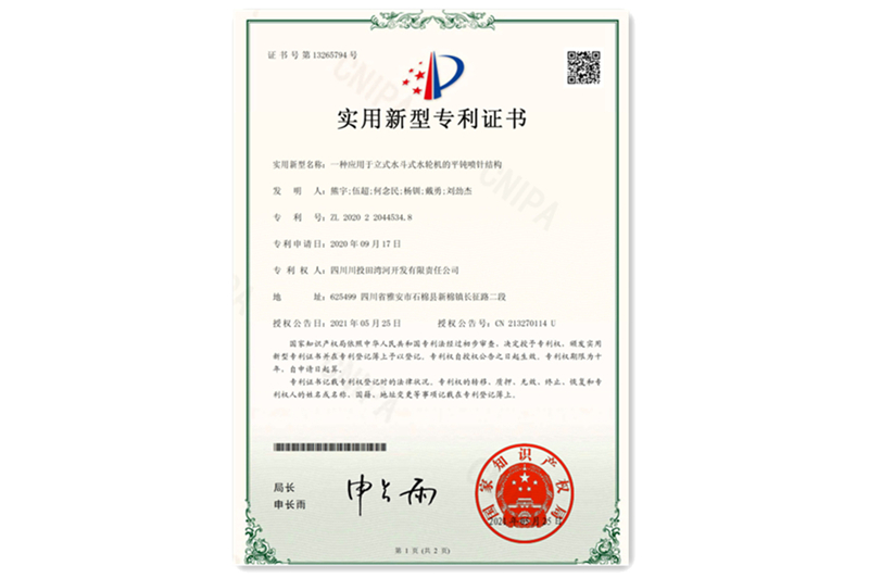 公司2021年5月,經(jīng)過(guò)近8個(gè)月的審查評(píng)估,公司終于成功申得實(shí)用新型專(zhuān)利?!耙环N應(yīng)用于立式水斗式水輪機(jī)的平鈍噴針結(jié)構(gòu)”是公司自2007年投產(chǎn)發(fā)電以來(lái)在水輪發(fā)電機(jī)組設(shè)備技術(shù)改造領(lǐng)域成功申報(bào)的第一個(gè)專(zhuān)利,也是公司2020年“科技之光”黨建品牌的重要成果,為公司“科技引領(lǐng),創(chuàng)新發(fā)展”旗幟添上了濃墨重彩的一筆,也為公司引領(lǐng)行業(yè)方向、樹(shù)立行業(yè)標(biāo)桿奠定了扎實(shí)基礎(chǔ)。
