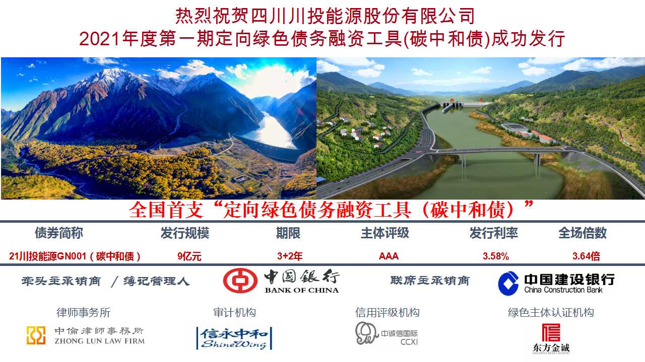 7月15日,四川川投能源股份有限公司成功發(fā)行2021年度第一期定向綠色債務(wù)融資工具(碳中和債)(簡稱:21川能投GN001,代碼:q21071406.IB),本次發(fā)行金額9億元,期限3+2年,票面利率3.58%,屬目前同期限同定向債務(wù)融資工具的全國最低價格。募集資金將專項用于收購?fù)ぷ涌谒こ添椖?0%股權(quán)。